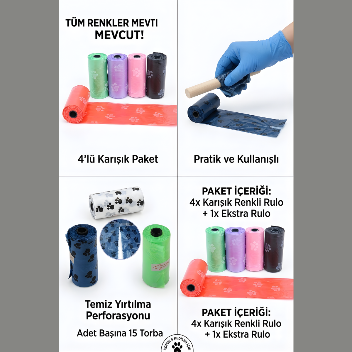 Köpek Kaka Poşeti 4lü Set 1 Rulo 15 adet Kaka poşeti içerir. 4 Rulo Toplam 60 adet Kaka poşeti gönderilecektir. Poşet boyutları: 30 cm x 21 cm